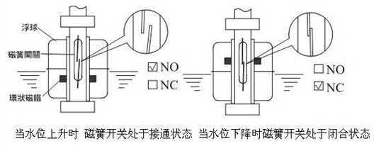 螺紋連接 產品規格︰ PP,PVDF材質可適用于強酸鹼場所;SUS304/316金屬材質適用于高溫高壓桶槽 接線盒規格*齊全,有塑膠、鋁合金、不銹鋼防爆型,防護等級IP-65以上 接點容量50W/250VAC SPST或40W/250VAC SPDT 接續法蘭有JIS,DIN,ANSI規格;牙口有NPT,PF,BSP等規格 可做多點控制、安裝容易、節省成本 特殊規格亦可配合客戶需求訂 。下圖為常閉(NC)及常開(NO)時浮球開關的相關位置。不銹鋼浮球液位開關工作原理圖
